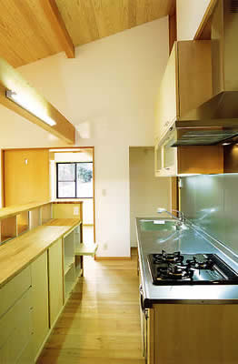 左に見える入口は夫の部屋へ、レンジフードの右側は妻の部屋への入口となっていて中で引き戸を介して繋がっている。